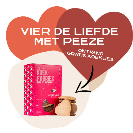 Vier de liefde met Peeze. Nu bij elke koffie en/of theebestellingen boven de €25,- een gratis doosje met heerlijke vanille-chocoladekoekjes. Speciaal gemaakt door de koekenbakkers van De Koekfabriek.