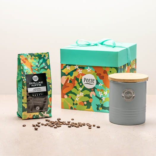 De prijswinnende en meest populaire koffiebonen van Peeze, de Amora - dark roast. In dit luchtdichte voorraadblik kun je deze bonen goed bewaren.